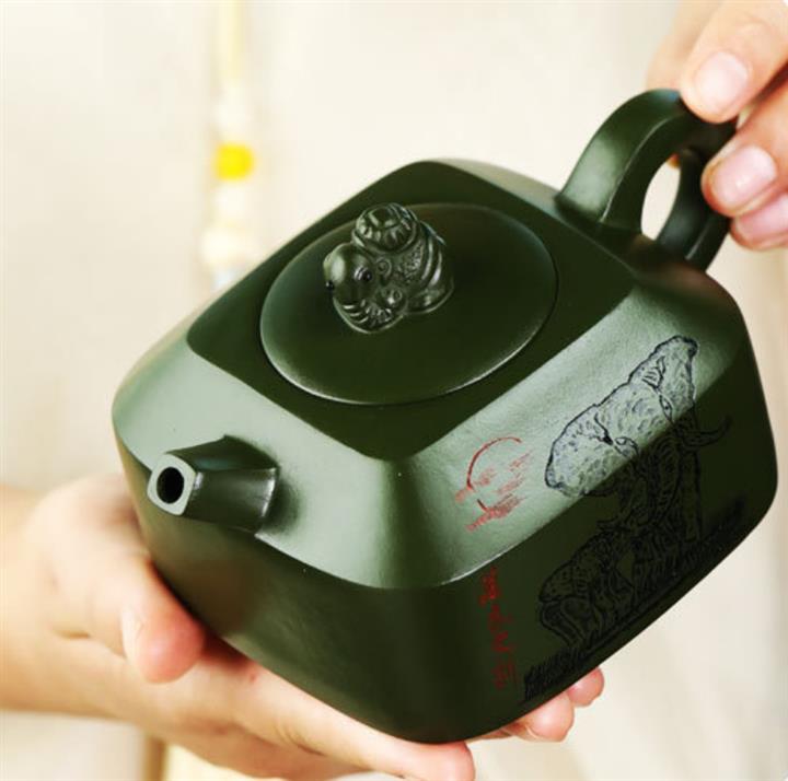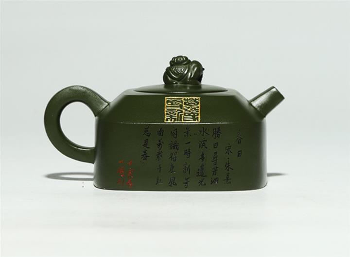 【介紹】作者簡介:李盧春。筆名小李逸刀。紫砂人才庫會員、工藝美術師。憑藉著對紫砂藝術的鉆研和領悟,形成了自己的藝術理念,把握傳統開創現代,融創文化追求創新,所創作品渾厚大方,線條流暢,個性鮮明藝術語言豐富,作品曾多次獲得國內外行業大獎其作品被各地博覽館收入,並深受海內外壺友喜愛與好評。 肉眼可見的豆青砂質感。「萬象更新」挑砂刻,雙刀刻朱熹古詩《春日》,采用老師家藏豆青砂。